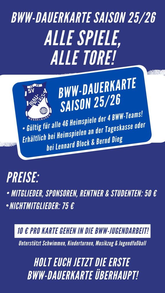 Holt euch die neue Dauerkarte für die Saison 2025/2026 für alle Heimspiele der 4 BWW-Teams. Gültig ist die Karte für alle Heimspiele – erhältlich an der Tageskasse oder bei Lennard Block und Bernd Dieg.